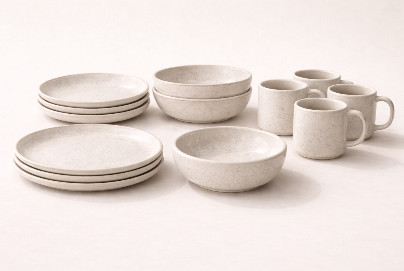 The “Everyday Stoneware” 16-piece set is designed as a reliable, beautiful foundation for daily dining. With four complete place settings, it covers everything you need for everyday meals—breakfasts, lunches, dinners, and relaxed gatherings—without feeling excessive or formal.