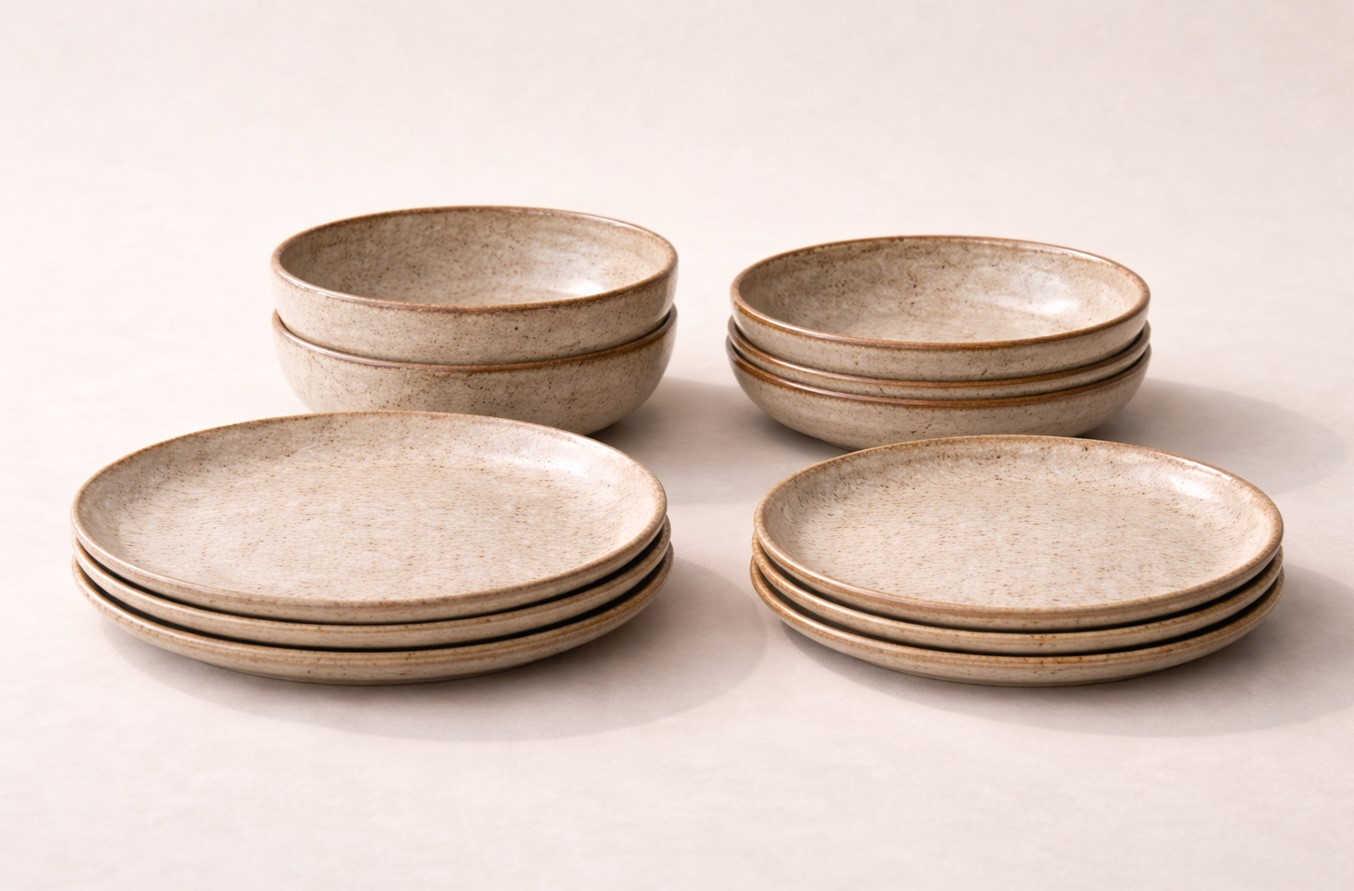 The set includes dinner plates, side plates, and bowls—covering everyday needs from main courses and salads to soups, breakfasts, and desserts. Each piece features subtle glaze variation and organic texture, giving the set its distinctive rustic character without feeling heavy or overly decorative.